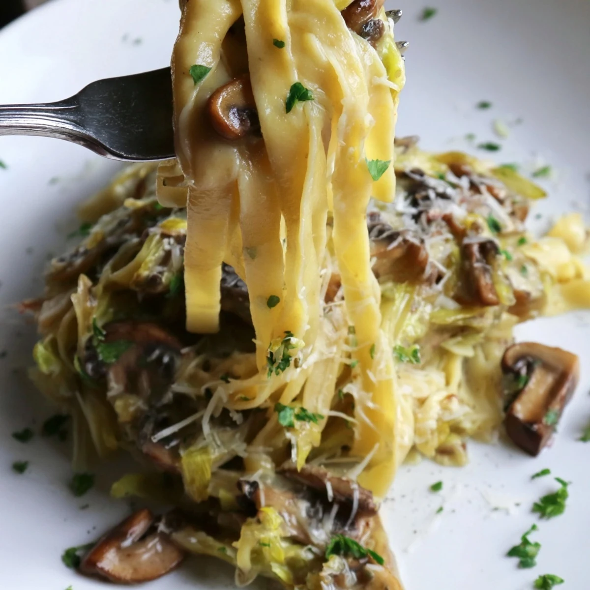 Slow-cook thinly sliced leeks in butter and olive oil until deeply caramelized, then sauté mushrooms until browned and their liquid evaporates. Cook tagliatelle al dente and reserve pasta water. Stir warm cream and grated Gruyere into the vegetables, add pasta and toss until glossy; loosen with reserved water as needed. Finish with black pepper, a pinch of nutmeg and chopped parsley, and serve immediately.