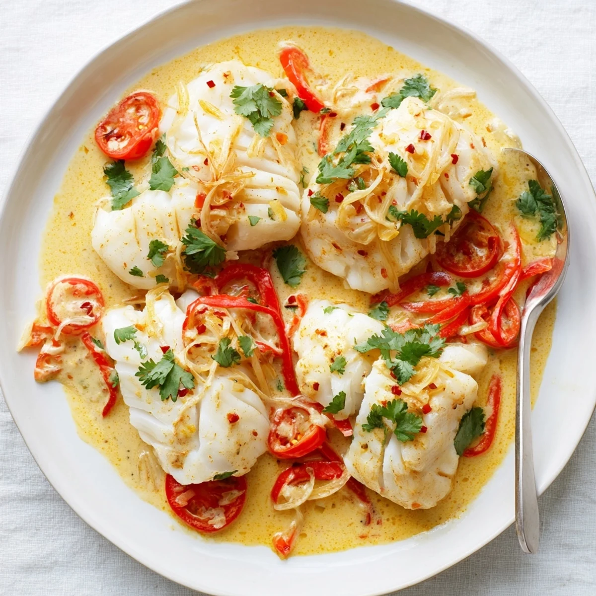 One weekday, I made this for friends who arrived late, damp from rain and starved. Placing the bubbling, golden sauce-smothered cod on the table, I remember how everyone instantly quieted, inhaling those layers of spice and coconut as steam fogged the windows. It felt like we all thawed out together.