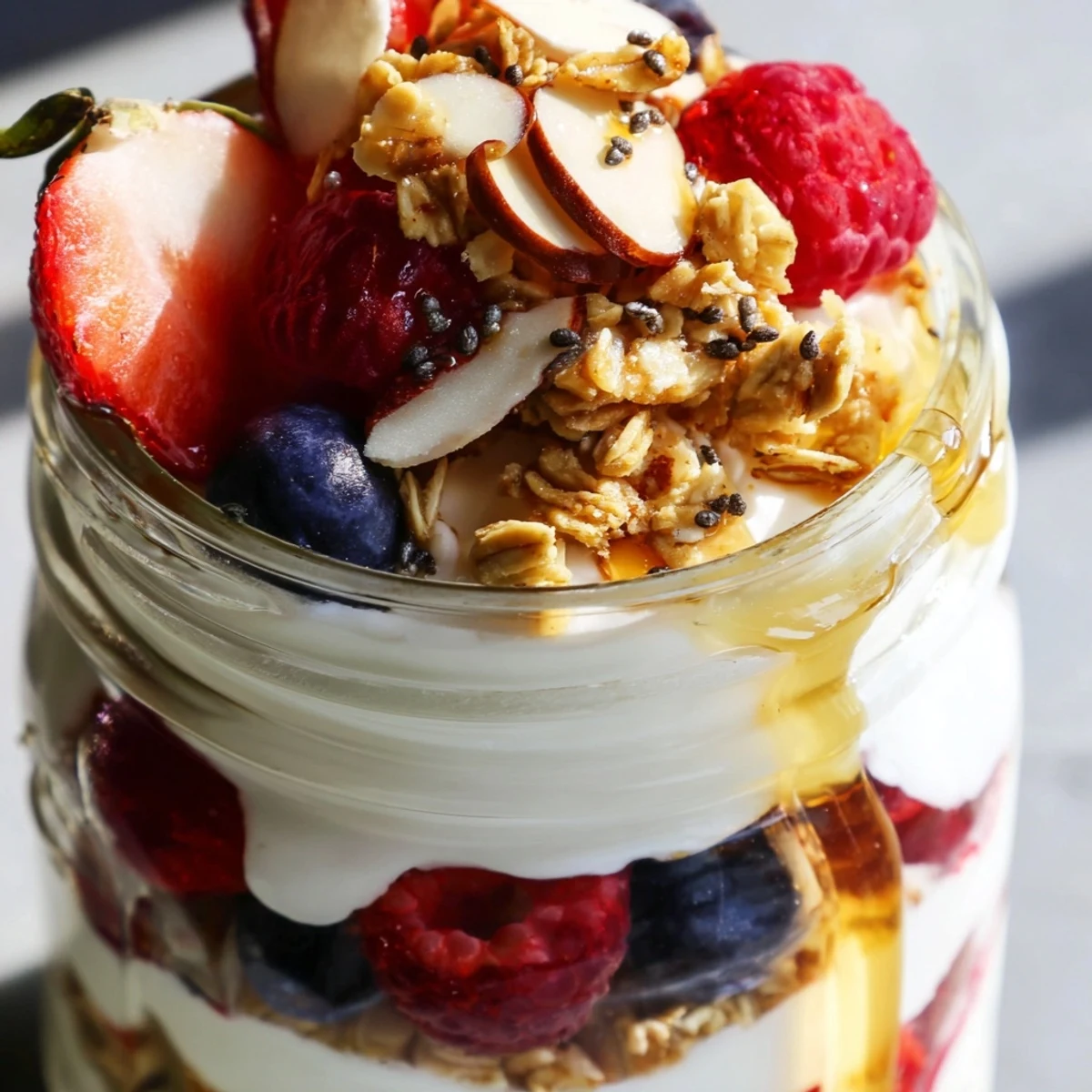 Start with yogurt at the bottom to provide a stable base. Add a thin drizzle of sweetener, then fruit, followed by granola. Repeat these layers until your glass is filled, finishing with granola and toppings on top for visual appeal. Clear glasses showcase the beautiful layers.