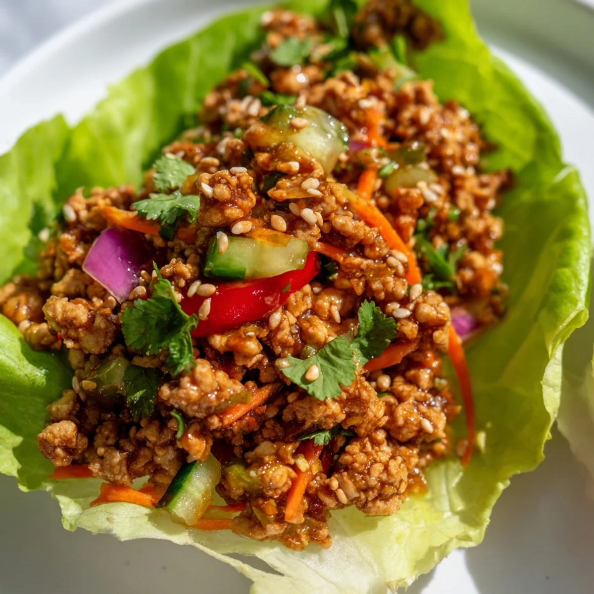 These fresh lettuce wraps bring together lean ground turkey, crisp vegetables, and Asian-inspired seasonings in a light yet satisfying bowl. The turkey gets incredible depth from soy sauce, hoisin, and rice vinegar, while colorful bell peppers, carrots, and cucumbers add crunch and freshness. Each crisp lettuce cup holds perfectly seasoned meat, topped with fragrant cilantro, nutty sesame seeds, and bright lime wedges for squeezing.