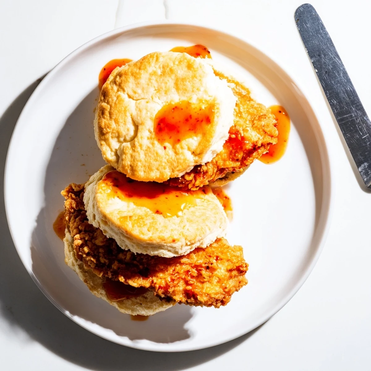 - Split each biscuit, place a piece of crispy chicken on the bottom half, drizzle generously with hot honey, and crown with the top. Serve immediately while the crunch is still singing.