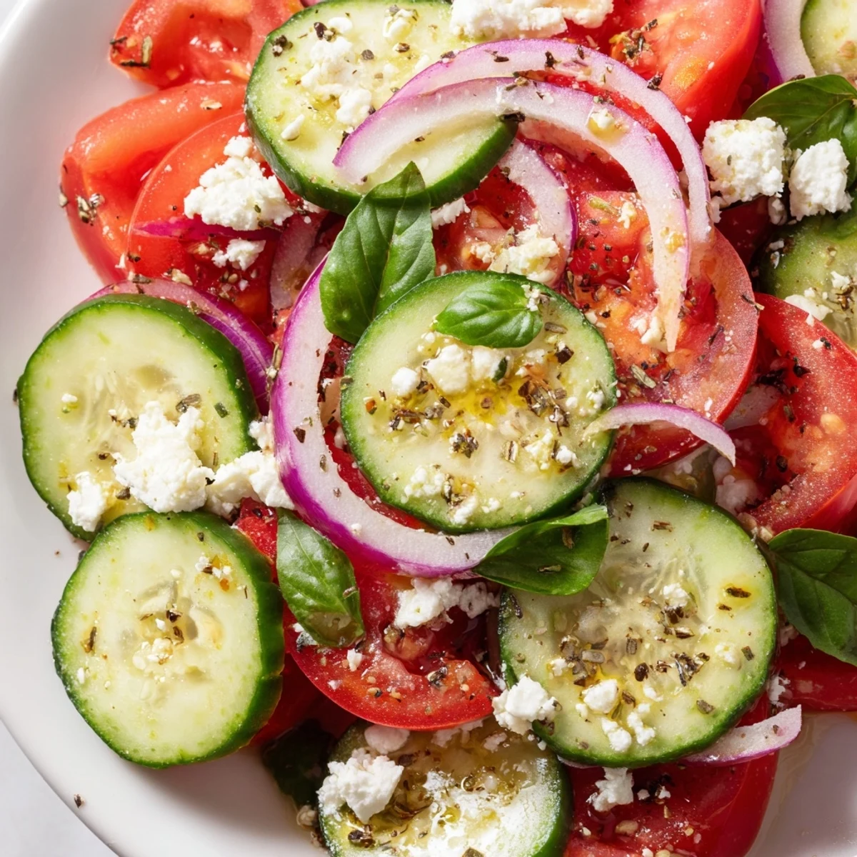 This vibrant Italian-inspired salad brings together crisp cucumbers, juicy tomatoes, and thinly sliced red onions in a tangy olive oil and red wine vinegar dressing. Fresh basil adds aromatic brightness while garlic and oregano provide classic Mediterranean flavors. Ready in just 15 minutes, this refreshing dish is perfect for warm weather dining, potlucks, or as a light side alongside grilled meats and crusty bread.