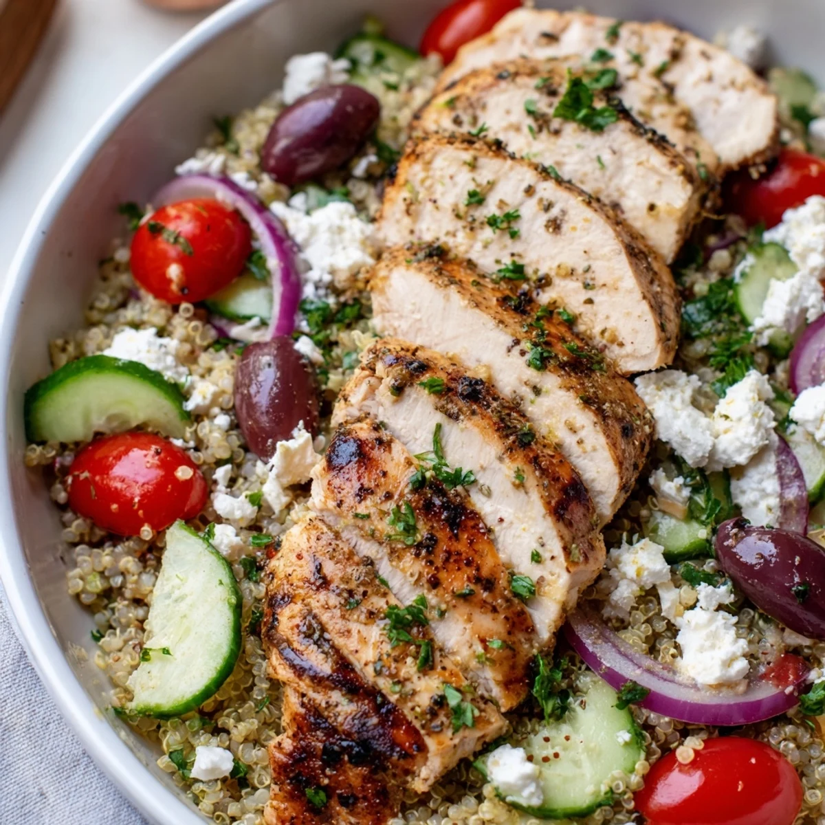 This wholesome bowl combines juicy grilled chicken seasoned with oregano, paprika, and cumin over a bed of fluffy quinoa. Fresh cherry tomatoes, crisp cucumber, red onion, Kalamata olives, and tangy feta add layers of Mediterranean flavor. A bright lemon-honey dressing ties everything together. Ready in just 45 minutes, this gluten-free, high-protein dish works beautifully for meal prep or weeknight dinners.