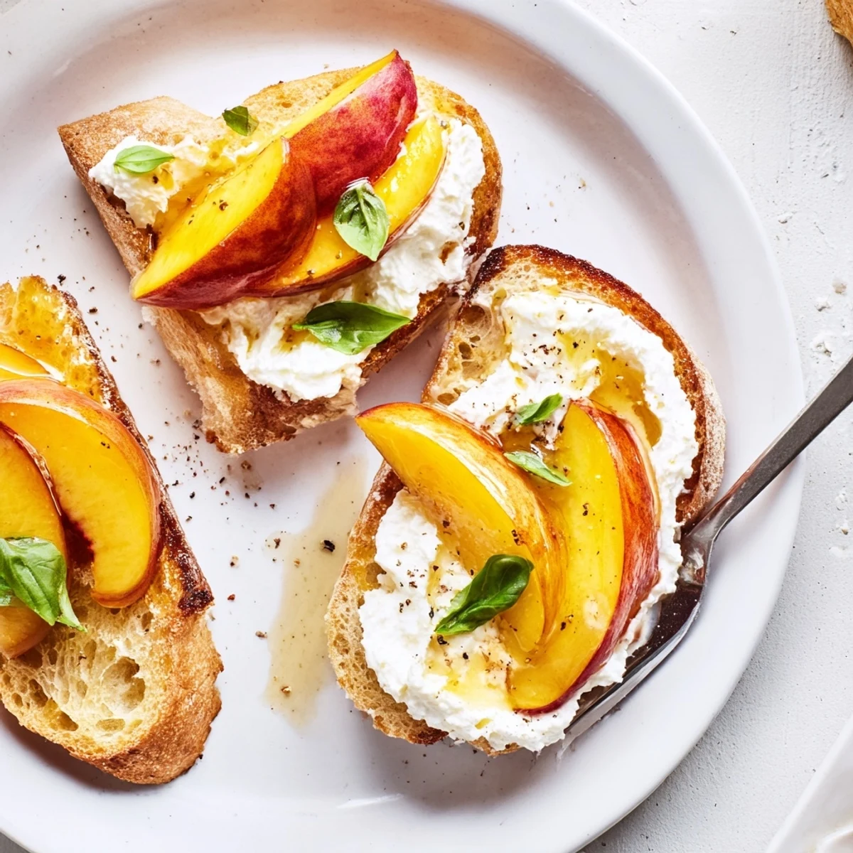 Whip whole-milk ricotta with a splash of heavy cream, lemon zest and sea salt until light and spreadable. Toast or grill baguette slices brushed with olive oil until golden. Toss thin peach slices with honey and lemon, then pile on the ricotta-topped toasts. Finish with torn basil, flaky salt and cracked pepper. Serve immediately; store components separately to keep crunch.