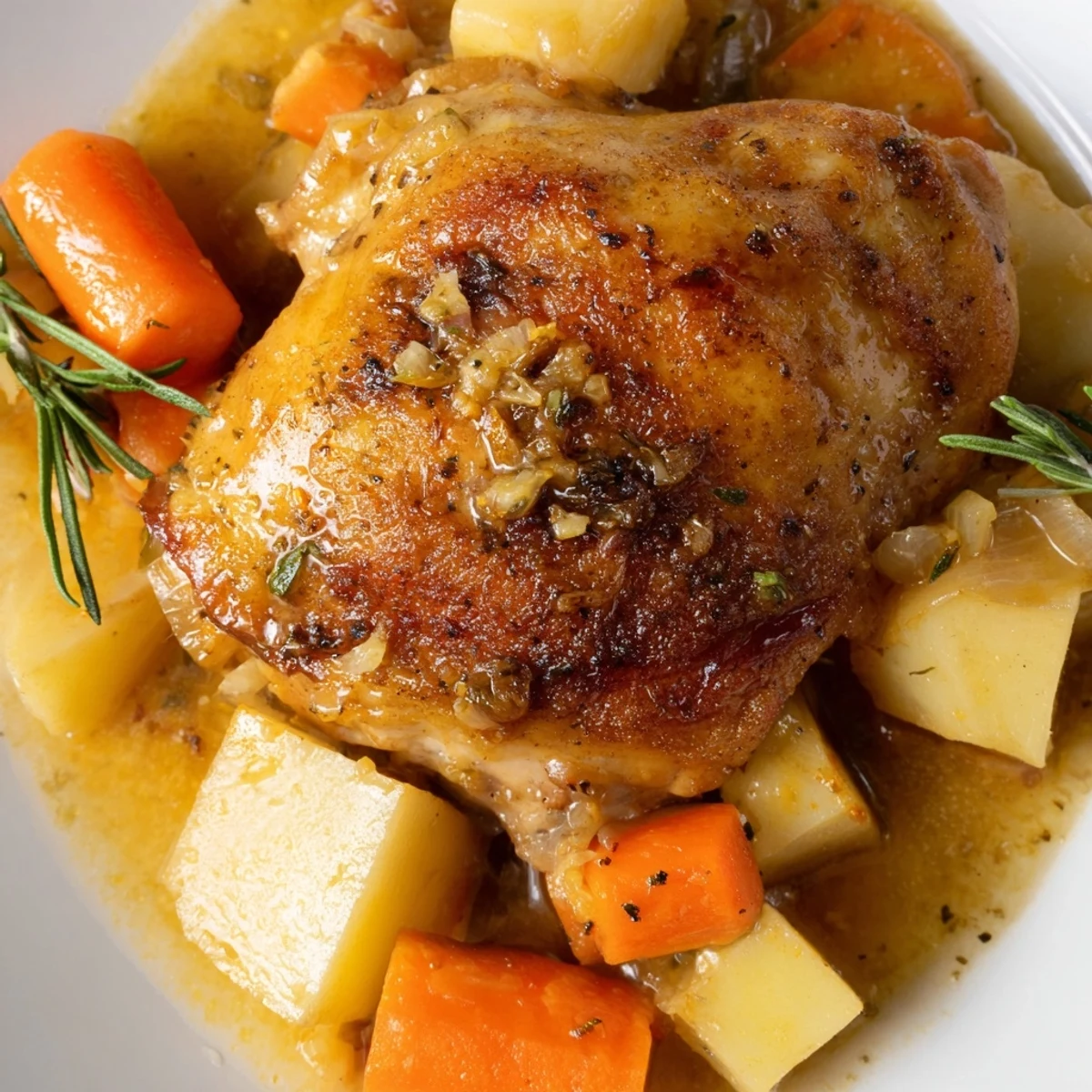 This comforting one-pot dinner features tender chicken thighs slow-cooked to perfection alongside hearty vegetables. Carrots, potatoes, celery, and onions create a robust base, while dried thyme, rosemary, and paprika infuse the dish with aromatic depth. The low-sodium chicken broth creates a savory sauce that brings everything together beautifully.