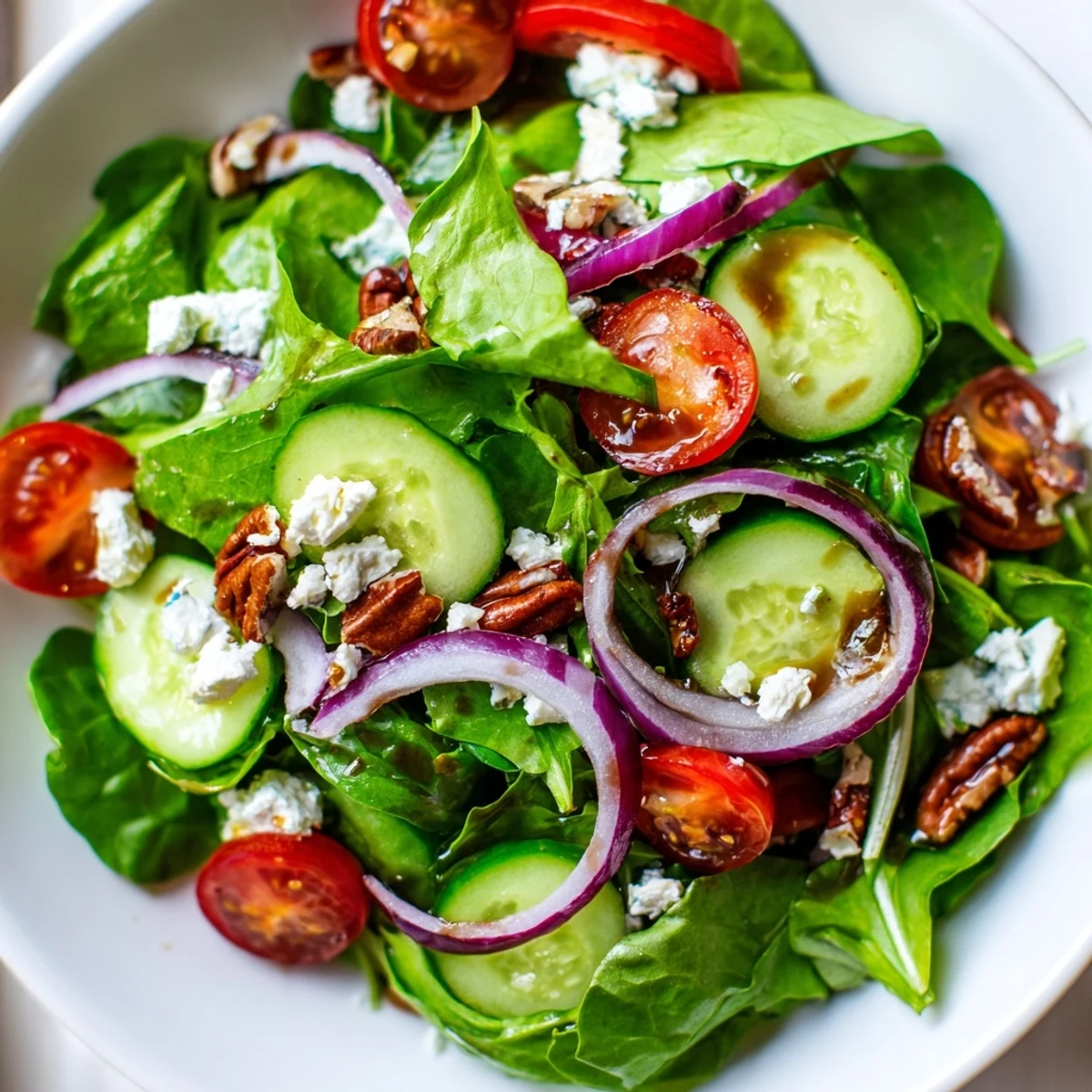 This fresh spring salad combines baby lettuces, arugula, and spinach with thinly sliced cucumber, sweet cherry tomatoes, red bell pepper, and red onion. The homemade balsamic vinaigrette features extra-virgin olive oil, Dijon mustard, and honey for perfect balance. Optional feta cheese adds creaminess while toasted pecans provide crunch. Ready in just 10 minutes, this versatile dish works beautifully as a starter or side. Customize with avocado, strawberries, or grilled chicken for variations.